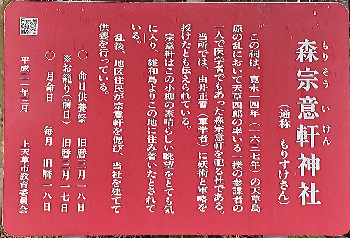 | 森宗意軒神社 (通称 もりすけさん) この祠は、寛永14年(1637年)の天草島原の乱において天草四郎の率いる一揆の参謀者の一人で医学者でもあった森宗意軒を祀る社である。 当所では、由井正雪(軍学者)に妖術と軍略を授けたとも伝えられている。 宗意軒はこの小柳の素晴らしい眺望をとても気に入り、維和島よりこの地に住み着いたとされている。 乱後、地区住民が宗意軒を偲び、当社を建てて供養を行っている。 ○ 命日供養祭 旧暦3月18日 ※お籠り(前日)旧暦3月17日 ○ 月命日 毎月 旧暦18日 平成21年3月 上天草教育委員会 |