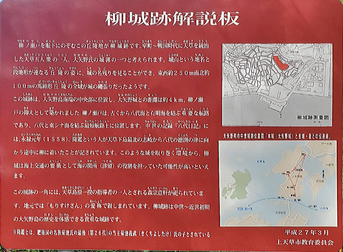 | 栁城跡解説板 柳の瀬戸を眼下にのぞむこの丘陵地が栁城跡です。室町~戦国時代に天草を統治した天草五人衆の一人、大矢野氏の城郭の一つと考えられます。城山という地名と段地形が連なる丘陵の姿に、城の名残りを見ることができ、東西約250m南北約100mの馬蹄形丘陵の全域が縄張りだったようです。 この城跡は、大矢野島南端の中央部に位置し、大矢野城との距離は約4km、柳ノ瀬戸の抑えとして築かれました。栁ノ瀬戸は、古くから八代海と有明海を結ぶ重要な航路であり、八代と東シナ海を結ぶ最短航路上に位置します。中世の記録『八代日記』には、永禄元年(1558)、隆鑑という人が天草下島最北の志岐から八代の徳渕の津に向かう途中に柳に着いたことが記されています。このような城を取り巻く環境から、栁城は海上交通の要衝として海の関所(津留)の役割を担っていた可能性が高いといえます。 この城跡の一角には、天草島原一揆の指導者の一人とされる森宗意軒が祀られています。地元では「もりすけさん」の愛称で親しまれています。栁城跡は中世~近世初期の大矢野島の歴史を体感できる貴重な城跡です。 ※隆鑑とは、肥後国の名族菊池氏の最後(第26代)の当主菊池義武(きくちよしたけ)氏の子とされている。 平成27年3月 上天草教育委員会 |