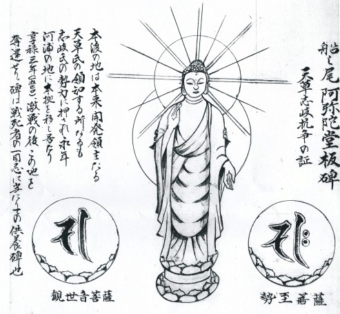 | 天草が誇る至宝・祇園橋。 その北側の丘にあるのが、祇園橋の名前の由来になった祇園社。その裏側にあるのが、この『尾越の板碑』と呼ばれる、隠れた天草史の至宝といっても過言でない板碑。この石板には、阿弥陀如来像と梵字で表された勢至菩薩と観音菩薩、さらに下部に建立の意味を表す碑文が書かれている。特に阿弥陀如来像は線刻で描かれ見事である。 残念ながら、彫りが浅いのと、年月の為、判別しがたいが、これは『天草唯一最古 貴重な碑文』と、この碑をもっと、多くの人に知って欲しいというのが、上中万五郎さん。 天草市の指定文化財となってはいるが、殆どの人は興味も示さないで、この存在を知る人は些少であろう。 これを憂う万五郎さんは、是非この文化財の貴重さを多くの人に知って欲しいと思って、このバンプを作成した。。 この碑は、今から約五百年前の享禄四年(一五三一)に造られたものという。 当時の天草は、いわゆる五人衆といわれる五家の国衆が支配していた時代。この五人衆、時に争い、時に和睦し、長く天草を支配していた。 天草下島は、志岐氏と天草氏がほぼ同勢力で、勢力争いをしていたようである。 この碑が造られた享禄時代(1528~1531)は短く、この後日本史の激動の時代が始まる。 1532年 畿内一円に一向一揆が起きる。 1543年 鉄砲伝来。 1539年 川中島の戦い。 1549年 キリスト教伝来。 1560年 桶狭間の戦い。 1573年 室町幕府滅ぶ。 いわばこの戦いは、天草五人衆の最後のあがきだったのかも知れない。 そして、時代は進み、豊臣秀吉の全国統一の波に飲み込まれ、天草五人衆も必至に生き残りを図ったが、時代の大波には逆らえず、あえなく沈没と相成る。 この狭い、天草でちょっとでも領地を広げようと、互いに躍起になった時代。 それは、後世の人から見ると、滑稽に見えるかもしれないが、当時の為政者にとっては生き残りを懸けた生存競争であったようだ。 天草下島では、現在の苓北町を拠点とする志岐氏と、河浦町を拠点とする天草氏が鼎立していた。当時天草五人衆は菊池氏に加担しており、永正二年(1505)『中次某状写』によると、本戸は志岐氏のものと裁定が下さていた。 享禄になると、天草尚種は父祖の地、本戸の奪回の戦いに挑んでいた。享禄四年には、大きな犠牲の上に本戸の奪回に成功し、町山口川に近い尾越に戦没者供養の板碑を建てている。本戸に堅固な城を築き一族を配して志岐氏への守りを固めた。 (改訂版 天草の歴史 p53) 享禄三年(1530)天草尚種が宮路・久玉氏を抑え、志岐氏と本砥で対戦する。(本砥川を挟んで戦う)(苓北町史 p1169) 享禄三年(1530)天草氏、志岐氏を破り本戸城を築く。 四年(1531)本戸の洞慶寺において、僧侶百十人を集め、戦没将兵慰霊のため、法華経千部を読誦し、船の尾尾越の板碑が作られる、 (本渡市史 p1301) 詳しいことは分からないが、要するに本戸を巡る志岐氏と天草氏の戦いで、戦死将兵の供養のために、この板碑が作られたという事である 註 このページは、上中満(まんごろ)さんのバンプを参考に作成しました。 |