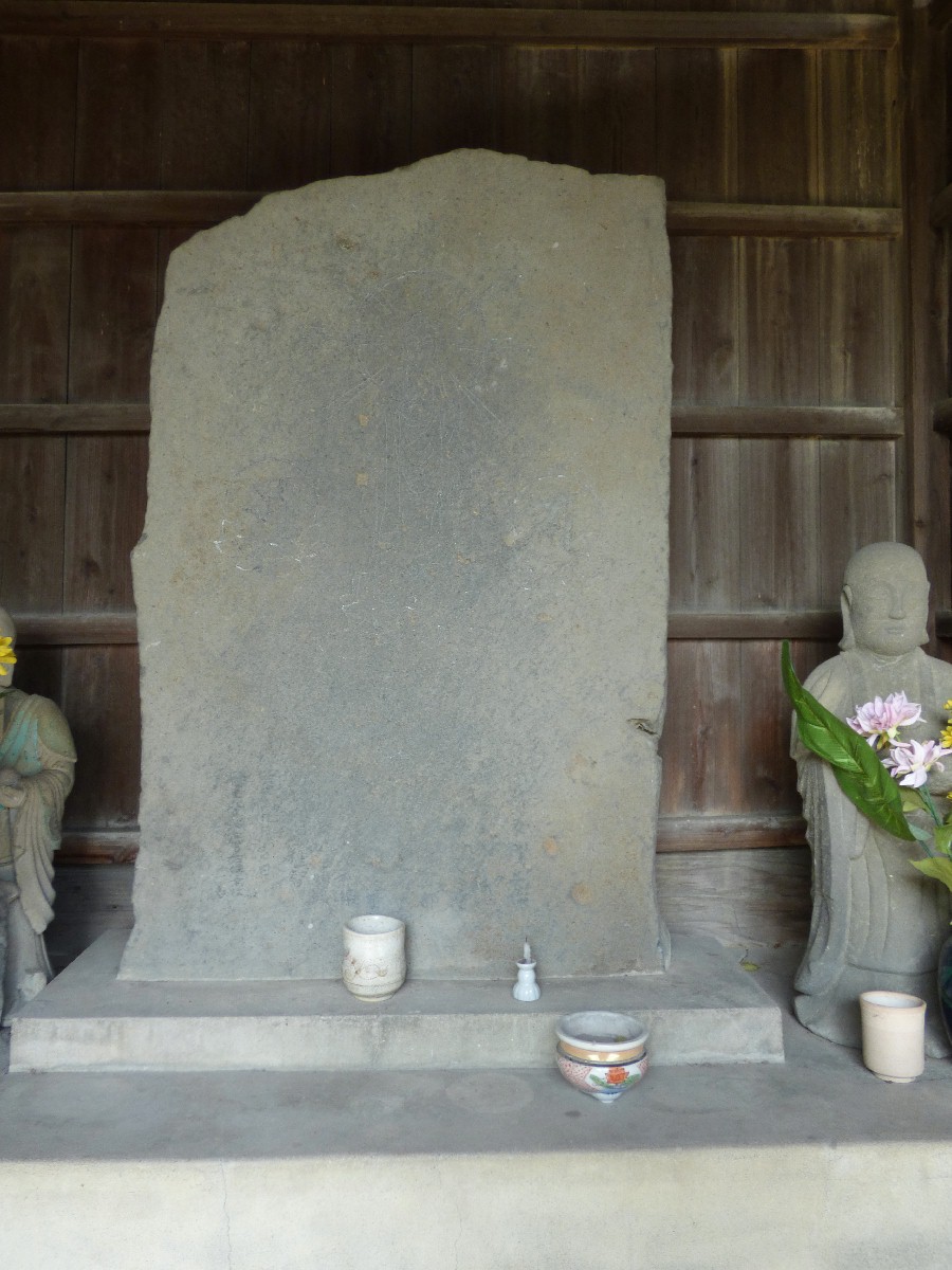 | この板碑は大きいもので、高さ1m20㎝、幅78㎝、厚さ12~5㎝もある。 そして板碑というように、石材を板状に加工してある。表面はほぼツルツルに加工してあり、機械のない時代にこれだけの加工をするのは大変で、かつ当時の技術の高さが分かる。 ただ、建立から約五百年が経過している事と、線刻が薄いため、判別は困難なのが残念。 その薄い刻字を、万五郎氏は得意の技術を駆使して、見事に再現されている。 |