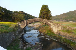 熊本県指定文化財 楠浦の眼鏡橋 指定年月日 平成18年5月29日 楠浦の眼鏡橋は、楠浦と宮地(現在の新和町)とを結ぶために方原川に架けられた石橋である。架橋に尽力したのは第一三代楠浦村庄屋宗像堅固で、明治11年(1879)に完成した。石材は下浦石という、地元天草の加工しやすい砂岩で、石工は下浦の松次、打田の紋次、足場組枠大工は楠浦の和田茂七である。 楠浦の眼鏡橋は、橋全体が緩やかなアーチをえがいており、ほかの石橋に比べて壁石が薄く、特にアーチ中央部は壁石がなく輪石のみという点が特徴的である。その姿は優美だが大変堅牢な橋である。また周囲の田園風景とよく調和し、特に楠浦諏訪神社秋季例大祭に神幸行列が橋を渡る様子は壮観である。 天草市教育委員会・天草市楠浦地区振興会 |