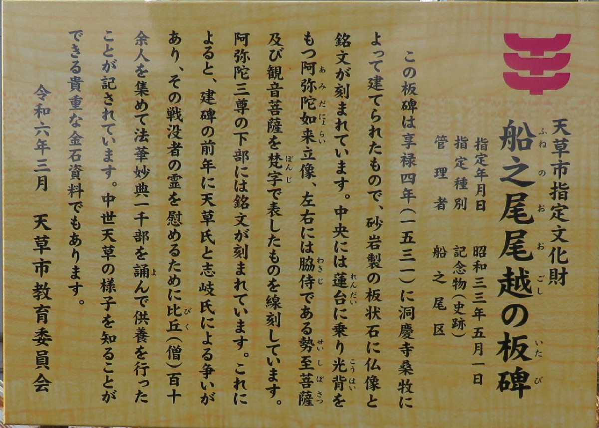 | 天草市指定文化財 船之尾尾越の板碑 指定年月日 昭和三三年五月一日 指定種別 記念物(史跡) 管理者 船之尾区 この板碑は享禄四年(一五三一)に洞慶寺桑牧によって建てられたもので、砂岩製の板状石に仏像と銘文が刻まれています。中央には蓮台に乗り光背をもつ阿弥陀如来立像、左右には脇侍である勢至菩薩及び観音菩薩を梵字で表したものを線刻しています。阿弥陀三尊の下部には銘文が刻まれています。これによると、建碑の前年に天草氏と志岐氏による争いがあり、その戦没者の霊を慰めるために比丘(僧)百十余人を集めて法華妙典一千部を誦んで供養を行ったことが記されています。中世天草の様子を知ることができる貴重な金石資料でもあります。 令和六年三月 天草市教育委員会 |