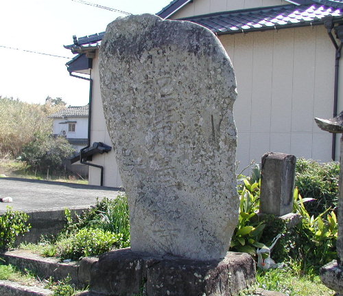 「溺死霊魂塔」 「維時寛政四年壬子四月朔日」 国道脇の民家の入り口にある。そのためか保存状態はいい。銘文もはっきり読み取れる。建立者21名の名が刻まれている。「寄人様の由来という旧有明町教育委員会の案内板が設置されている。 現在は、慰霊塔の前にある石室(八幡様)と一緒に建屋が作られていて、塔が見えなくなっている。残念なことだ。 |